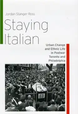 Staying Italian: Urban Change and Ethnic Life in Postwar Toronto and Philadelphia is a 2009 book by Jordan Stanger-Ross published by the University of Chicago Press. The book compares and contrasts Italian Americans in South Philadelphia to Italian Canadians in Little Italy, Toronto,[1] covering the post-World War II period,[2] and how the two communities define what it means to have an "Italian" identity.[3] The book compares and contrasts the communities' employment patterns, religious practices, marriage practices, and choices of housing in the respective real estate markets.[4] Toronto's Italian community became geographically dispersed while Philadelphia's Italian community remained geographically concentrated;[5] Stanger-Ross explained that the territoriality was more important to Philadelphia's Italians compared to Toronto's, and that the lack of new Italian immigration to Philadelphia contributed to this difference. In Philadelphia African-Americans were settling the city,[6] and Italian Philadelphians feared that their neighborhood would be invaded by black people.[7] Philadelphia's Italians were less likely to move out of South Philadelphia, compared to Toronto's Italians in regards to their Little Italy.[8] In Toronto Italian immigration had continued,[6] and therefore many of the Italians were recent immigrants.[9] Many of them moved to outlying areas of the city and the suburbs.[7]