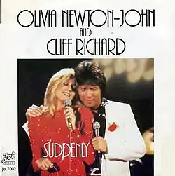"Suddenly" reached number 15 on the UK Singles Chart in October 1980 and number 20 on the US Billboard Hot 100 in January 1981.[3] It finished the year as number 91 on the Billboard Year-End Hot 100 Singles of 1981. It was also a major Adult Contemporary hit, reaching number four.[4] The music video shows Newton-John and Richard in a penthouse singing the song to each other, taken from her ABC TV special "Hollywood Nights" that aired before the 52nd Academy Awards on April 14, 1980.