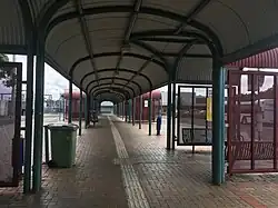 In late 1993, the station was refurbished, with upgrades included an enclosed booking lobby, an air-conditioned waiting room, repainting of the station buildings, and landscaping of the garden area around the station.[6] In 2005, as part of the Regional Fast Rail project, the layout of the station was again altered.