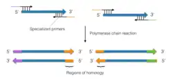Gap Repair Cloning. The blue arrows represent DNA contigs. Segments of the same colour represent complementary or identical sequences. Specialized primers with extensions are used in a polymerase chain reaction to generate regions of homology at the terminal ends of the DNA contigs.