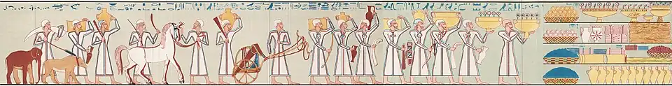 Syrians bringing presents to Pharaoh Tuthmosis III, as depicted in the tomb of Rekhmire, circa 1450 BCE (actual painting and interpretational drawing). They are labeled "Chiefs of Retjenu".[50][51]