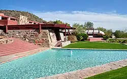 Wright had first visited the state of Arizona in 1927 while working as a consultant for the Arizona Biltmore Hotel.[32][33] He returned with several draftsmen in 1929 to establish the Ocotillo Desert Camp, a temporary camp in Phoenix, Arizona, while designing a resort for the developer Alexander J. Chandler.[34][35] The Ocotillo Camp was built around a plateau, on a grid of 30- and 60-degree angles.[36] Though rising heat prompted Wright's team to leave the camp after only a few months,[37] it was a precursor to the design of Taliesin West.[36] Wright later wrote that he had found the camp's canvas tents to be "enjoyable and sympathetic to the desert", in contrast to the "much too heavy midwestern house", which he found oppressive.[38] Furthermore, Wright was elderly and in declining health, and the original studio was costly to maintain during the winter.[39]