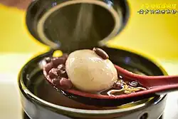 Tangyuan or tanguan are a traditional Chinese dessert made of glutinous rice shaped into balls that are served in a hot broth or syrup. They come in varying sizes, anything between a marble to a ping-pong ball,[1] and are sometimes stuffed with filling. Tangyuan are traditionally eaten during the Lantern Festival,[2] but because the name is a homophone for reunion (traditional Chinese: 團圓; simplified Chinese: 团圆; pinyin: tuányuán) and symbolizes togetherness and completeness, this dish is also served at weddings, family reunions, Chinese New Year, and the Dōngzhì (winter solstice) festival.[3]