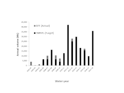 The SWIOID 2002 identifies a target of 27 GL (i.e. 30% of the Mean Annual Natural Flow- MANF) in a full allocation scenario. Since 2005–06, environmental water has been released to the Upper Murrumbidgee River to repair the condition of the river. Over the period 2005 to 2018, an average of 17.7 GL per year of environmental water has been released to the upper Murrumbidgee River. The annual allocation varied between 4 GL per year during the drought and 42.3 GL per year once sufficient water had been recovered.[5]