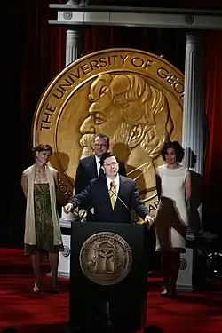 President Barack Obama guested during the show's final month, in a show taped from George Washington University in Washington, D.C.; Obama sat in Colbert's seat and presided over "The Wørd" segment.[83][84]