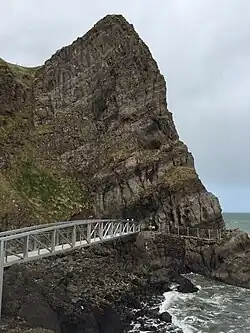 The Gobbins is a cliff-face running from Whitehead to Portmuck Harbour along the eastern coast of Islandmagee, County Antrim, Northern Ireland, on the Causeway Coastal Route.[1] The Gobbins cliff path runs across bridges, past caves and through a tunnel,[2][3] along The Gobbins cliffs (Irish: Gobán meaning "tip/point of land" or "headland").[4] The cliffs are recognised for their rich birdlife, important geology and notable species.[5] James Kerr lost his life by falling over the Gobbins cliffs on 11 Jun 1892 aged 14 years when collecting seagull eggs and he is interred in the nearby Ballypriormore Cemetery.