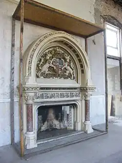 Edward Pugin's fireplace inside Granville House. Supported on red marble columns with the mantel carved in Caen stone, it bears the Granville coat of arms and the motto "pile on the logs to make the fire great". Circa 1869.