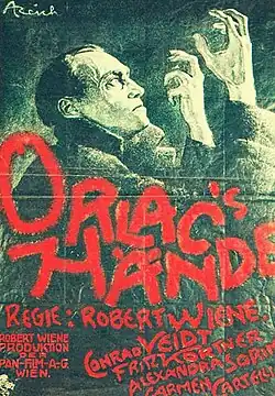 The Hands of Orlac (German: Orlac's Hände) is a 1924 Austrian silent film directed by Robert Wiene and starring Conrad Veidt, Alexandra Sorina and Fritz Kortner. It is based on the novel Les Mains d'Orlac by Maurice Renard.[1][2]