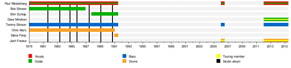 The Replacements were an American rock band formed in Minneapolis, Minnesota, in 1979.[8] The band was composed of the guitarist and vocalist Paul Westerberg, guitarist Bob Stinson, bass guitarist Tommy Stinson, and drummer Chris Mars for most of its existence. After two albums in the style of punk rock, they became one of the main pioneers of alternative rock with their acclaimed albums Let It Be and Tim. Bob Stinson was kicked out of the band in 1986, and Slim Dunlap joined as lead guitarist. Steve Foley replaced Mars in 1990. Towards the end of the band's career, Westerberg exerted more control over its creative output. The group disbanded in 1991 and the members found various projects. A reunion was announced on October 3, 2012.[9] Fans affectionately refer to the band as the 'Mats, a nickname which originated as a truncation of "The Placemats".[10][11]