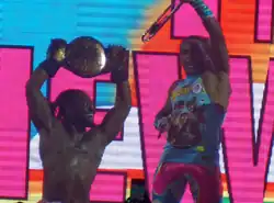 At Fastlane on February 21, The New Day began mocking The League of Nations (Sheamus, Alberto Del Rio, Rusev and King Barrett), calling them the "League of Booty".[52] They then continued to mock The League of Nations in various segments and skits while simultaneously feuding with other teams and turning into fan favorites in the process.[53] The New Day then retained their titles at Roadblock against Sheamus and Barrett on March 12[54] and the following night on Raw against Del Rio and Rusev, but were attacked by the entire League of Nations afterwards.[55] This led to a non-title six-man tag team match between the two stables at WrestleMania 32 on April 3, where The New Day lost,[56] but Big E and Kingston retained their championships once again against Sheamus and Barrett the following night on Raw.[57] At Payback on May 1, the final match of the tournament to determine the number one contenders for the WWE Tag Team Championship between Enzo Amore and Colin Cassady and The Vaudevillains (Aiden English and Simon Gotch) ended in a no contest after Amore suffered a legitimate concussion during the match.[58] As a result, The New Day faced The Vaudevillains for the WWE Tag Team Championship at Extreme Rules on May 22, where they retained their championship after Kingston interfered.[59] On the May 30 episode of Raw, The New Day defeated The Vaudevillains in a non-title match via disqualification after they were attacked by Luke Gallows and Karl Anderson, sparking a feud between them.[60] At Money in the Bank on June 19, The New Day defeated Gallows and Anderson, The Vaudevillains and Enzo and Cass in a fatal-four-way match to retain the WWE Tag Team Championship and, as of that victory, they hold the record for the longest combined reign as a tag team.[61] On the June 20 episode of Raw, The New Day confronted returning The Wyatt Family (Bray Wyatt, Erick Rowan and Braun Strowman) and interrupted Wyatt's promo, thus starting a feud between the two teams[62] that would lead to a non-title six-man tag team match at Battleground on July 24, where they would lose.[63][64]