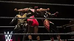 At Extreme Rules on April 26, The New Day defeated Kidd and Cesaro to capture the WWE Tag Team Championship; Big E and Kingston were the participants in the match, but WWE also recognized Woods as champion under the Freebird Rule, in which any two members of a stable can compete for the titles.[41] At Payback on May 17, Big E and Kingston defeated Kidd and Cesaro in a two-out-of-three falls match to retain the WWE Tag Team Championship after Woods pinned Cesaro, despite not being a legal participant in the match.[42] At Elimination Chamber on May 31, all three New Day members competed in the first-ever tag team Elimination Chamber match for the WWE Tag Team Championship, where they lastly eliminated The Prime Time Players (Darren Young and Titus O'Neil) to retain their titles.[43] However, at Money in the Bank on June 14, Big E and Woods lost the championships to The Prime Time Players. Big E and Kingston then lost their rematch at Battleground on July 19.[44] The New Day would regain the championship after they defeated Los Matadores (Diego and Fernando), The Lucha Dragons and The Prime Time Players in a fatal four-way match at SummerSlam on August 23. Despite being heels, the trio received heavy positive reactions from audiences who began to chant "New Day rocks!". The following night on Raw, they were attacked by the returning Dudley Boyz, with Woods being put through a table.[45] This started a feud between the two teams, setting up a title match at Night of Champions on September 20, where Big E and Kingston lost by disqualification, though, by rule, they retained their titles. They lost via disqualification to retain their championships again in a rematch against The Dudley Boyz at WWE Live from Madison Square Garden,[46] but defeated them via pinfall at Hell in a Cell on October 25 to retain the titles, thus ending their feud.[47] The New Day led their own team at Survivor Series including Sheamus and King Barrett, but left the match prematurely to tend to Big E after his elimination, leading to their team's eventual loss.[48] At TLC: Tables, Ladders & Chairs on December 13, they retained the WWE Tag Team Championship against The Lucha Dragons and The Usos (Jimmy and Jey Uso) in a triple threat ladder match.[49] The New Day then successfully defended their titles against The Lucha Dragons on the special December 22 episode of Super SmackDown Live![50] and against The Usos on January 24, 2016, at the Royal Rumble event.[51]