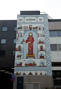According to the marriage certificate issued on 14 April 972 Theophanu is identified as the neptis (niece or granddaughter) of Emperor John I Tzimiskes (925–976, reigned 969–976) who was of Armenian and Byzantine Greek descent. She was of distinguished noble heritage: the Vita Mahthildis identifies her as augusti de palatio and the Annales Magdeburgenses describe her as Grecam illustrem imperatoriae stirpi proximam, ingenio facundam.[3] Recent research tends to concur that she was most probably the daughter of Tzimiskes' brother-in-law (from his first marriage) Constantine Skleros (c. 920–989), brother of Bardas Skleros and great-grandnephew of Basil I, and cousin Sophia Phokas, the daughter of Kouropalatēs Leo Phokas, brother of Emperor Nikephoros II (c. 912–969).[4][5][6][7]