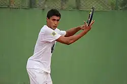 Thiago Moura Monteiro was born on 31 May 1994 in Fortaleza, Brazil. His first introduction to tennis happened when he watched a Gustavo Kuerten match on TV with his brother.[4] Monteiro used to train football at a sports academy where his brother played tennis. He played it for the first time when his brother invited him to a hitting session. Thiago soon started training and playing in local tournaments: in early 2004, he won his first tournament, being only nine years old.[5] Thiago would leave his hometown, Fortaleza, in late 2008 to enter the Larri Passos Academy in Balneário Camboriú to improve his game. He later said on interviews that he would probably be a football player if he had not made that change.[6]