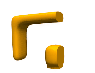 A vertical displacement or load is added to a small region on the upper right edge of the C-shape. The vertical displacement is prescribed such that the upper beam of the C-shape contacts the lower beam of the C-shape. When contact is established, a corner of the upper beam will slide along the lower beam, resulting in severe shear within the third medium. Additionally, the free edge on the right boundary of the third medium is not bounded, leading to severe distortions in the third medium, which are handled by the third medium material model and the applied regularization.