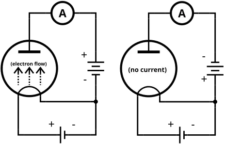 Edison's circuit configured his bulb (large circle) such that its electrode was in series with an ammeter (A) to measure conventional current and a voltage source (separate from the power source heating the filament) to bias the electrode either positively (in which case electrons were attracted and flowed along the arrows from the filament through the partial vacuum to the electrode) or negatively (which resulted in no measurable current). We now know that in addition to carbon molecules, the filament was emitting electrons, which have negative charge and thus are attracted to a positively-charged electrode but not a negatively-charged electrode.