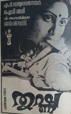 Thrishna is a 1981 Indian Malayalam film written by M. T Vasudevan Nair, directed by I. V. Sasi and produced by Rosamma George. The film has musical score by Shyam. The film stars Mammootty, Rajyalakshmi, Swapna and Kaviyoor Ponnamma in the lead roles. The film gave Mammootty his major break as a solo hero. The film tells the story of Das (Mammootty), who is a rich playboy and his relationships with his callgirl, Jaysree (Swapna) and his love interest, Sridevi (Rajyalakshmi). Rosamma George won the 1981 Filmfare Award for Best Film - Malayalam for this film.[1][2][3][4][5][6][7]
