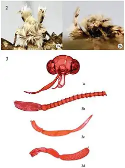 Head structure of T. indica, โ™‚. 2 Head with scales: 2a dorsal view; 2b lateral view; 3 Head scales removed: 3a head, slide No. NKYLL012; 3b antenna; 3c labial palpus; 3d maxillary palpus