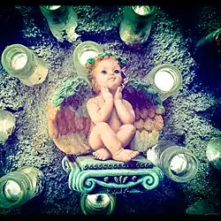 Most of the space available was used to display the art. Many old items used by the Sanchez family in their daily lives were incorporated into the displays, such as a bicycle in cement. One of the larger works is a chapel that is composed almost only of empty beer bottles.[3][8][9] Inside, there is a painted ceiling similar to the Sistine Chapel and multicolored pews.[6] City officials originally considered the art to be trash and an eyesore, and had to spend three years in court against the city.[4]