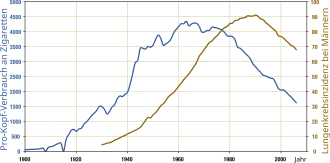 German scientists identified a link between smoking and lung cancer in the late 1920s, leading to the first anti-smoking campaign in modern history, albeit one truncated by the collapse of Nazi Germany at the end of World War II.[10] In 1950, British researchers demonstrated a clear relationship between smoking and cancer.[11] Evidence continued to mount in the 1960s, which prompted political action against the practice. Rates of consumption since 1965 in the developed world have either peaked or declined.[12] However, they continue to climb in the developing world.[13] As of 2008 to 2010, tobacco is used by about 49% of men and 11% of women aged 15 or older in fourteen low-income and middle-income countries (Bangladesh, Brazil, China, Egypt, India, Mexico, Philippines, Russia, Thailand, Turkey, Ukraine, Uruguay, and Vietnam), with about 80% of this usage in the form of smoking.[14] The gender gap tends to be less pronounced in lower age groups.[15][16] According to the World Health Organization, 8 million annual deaths are caused by tobacco smoking.[17]