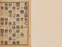 Tongguk chŏngun (Korean동국정운; Hanja東國正韻; lit.'Standard Rhymes of the Eastern State')[a] is a rhyme dictionary that sets out standard phonetics for the Sino-Korean pronunciations of Chinese characters (Hanja). It was completed in September 1446 and compiled in 1447, being published, printed, and distributed the following year, under the instructions of Sejong the Great from the Joseon Dynasty, and serves as a companion volume to his Hunminjeongeum.[1][2]