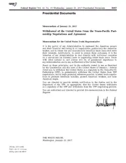 On 23 January 2017, US President Donald Trump signed a presidential memorandum to withdraw the United States' signature from the agreement, making its ratification as it was in February 2016 virtually impossible.[29]