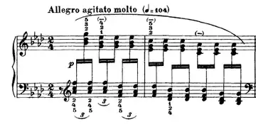 Passage work for the left hand is rather difficult, while the right hand plays the melody mostly in octaves. Other difficulties include cramped spacing (the hands are often close together), left-hand arpeggiated passage work, complex figurations in polyrhythm, and the right hand ascending the keyboard in swiftness using only the thumb, the third, and fourth finger.