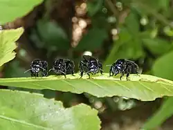 The species has many predators with the main being birds,[8] humans,[8] mustelids,[13] bears,[13] anteaters (Tamandua, Myrmecophaga),[13] armadillos[13] and opossums.[13] They must also deal with nest infiltrators and parasites as well. In Trigona fuscipennis' nests, parasitic mites have been found to infest their larvae.[13] It has also been found that some species have adapted to mimic Trigona fuscipennis nests in order to capitalize on the species' known aggression. Trigona necrophaga, in particular, mimics the nest structure of T. fuscipennis by having a similar large-scooped nest entrance. However, T. necrophaga are not aggressive.[13]