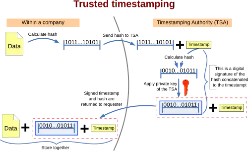 The technique is based on digital signatures and hash functions. First a hash is calculated from the data. A hash is a sort of digital fingerprint of the original data: a string of bits that is practically impossible to duplicate with any other set of data. If the original data is changed then this will result in a completely different hash. This hash is sent to the TSA. The TSA concatenates a timestamp to the hash and calculates the hash of this concatenation. This hash is in turn digitally signed with the private key of the TSA. This signed hash + the timestamp is sent back to the requester of the timestamp who stores these with the original data (see diagram).
