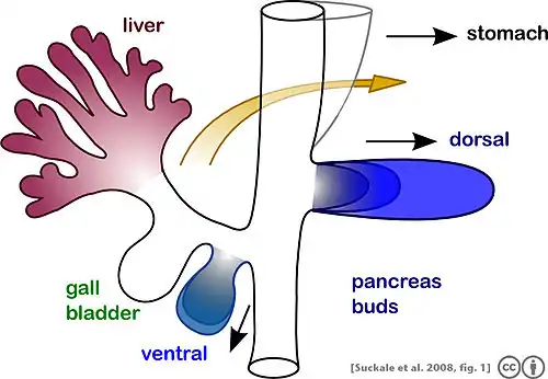The pancreas forms during development from two pancreatic buds that arise from the duodenal part of the foregut, an embryonic tube that is a precursor to the gastrointestinal tract.[11] It is of endodermal origin.[11] Pancreatic development begins with the formation of a dorsal and ventral pancreatic bud. Each joins with the foregut through a duct. The dorsal pancreatic bud forms the neck, body, and tail of the developed pancreas, and the ventral pancreatic bud forms the head and uncinate process.[11]