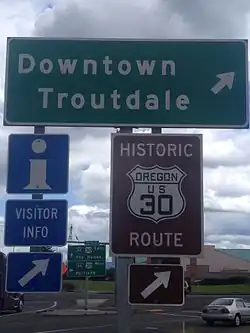 Sections of the highway between The Dalles and Ontario generally follow the route of the Oregon Trail, which was used in the 19th century by U.S. settlers to reach the Willamette Valley.[2] US 30 was created as part of the initial U.S. Numbered Highway System adopted by the American Association of State Highway Officials on November 11, 1926. The number was assigned in place of US 20, which had originally been planned for the corridor in Oregon, after objections from the state government.[3] The new national highway incorporated portions of existing state roads, including the Historic Columbia River Highway, which was constructed between 1913 and 1922 through the Columbia River Gorge.[4][5]