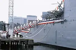 Crew members manning the ship during Bunker Hill's commissioning ceremony