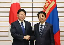 He has also served as a mediator between Japan and North Korea.[23] Khürelsükh made an official visit to Japan in December 2018 and met Prime Minister Shinzo Abe to reiterate close bilateral cooperation as part of a Japan-Mongolia Summit Meeting. Following the summit meeting the signing of the “Memorandum of Cooperation Between the Ministry of the Environment of Japan and the Ministry of Environment and Tourism of Mongolia on Environmental Cooperation” took place in the presence of the two leaders, and a Japan-Mongolia joint statement and fact sheet for the “Japan-Mongolia Mid-term Action Plan for a Strategic Partnership” were also issued.[24] The two sides also discussed about the New Ulaanbaatar International Airport.