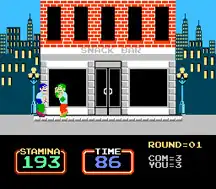 Battles use a "best 3-of-5 rounds" format.[9] At the start of each round, both fighters begin with 200 stamina points.[9] Each punch costs the player one point of stamina to perform, while the weak punch inflicts four points of stamina damage and the strong punch inflicts ten points. A man will occasionally drop flower pots from the windows; if hit by a pot, a fighter will take five points of damage and be temporarily dazed.[6][10] In addition, a patrol car may pass by at any point in the fight, which causes the fighters to return to their starting positions.[6] If a fighter runs out of stamina, they become vulnerable and every attack will inflict the same amount of knockback on them as a strong punch. When a fighter is pushed to the edge of the screen, the round ends as they are knocked off the sidewalk onto the street, and the battle shifts to the next block for the next round.[8] Each round also features a 99-second timer; if time runs out before the round is complete, the police will arrest the fighter closest to the edge of the screen, making the other player the winner of the round.[10] When a fighter has lost two rounds, an open sewer manhole appears on the street behind them; the player who successfully pushes their opponent into the manhole is declared the winner, briefly celebrating as a woman showers them with confetti from a window.[8]