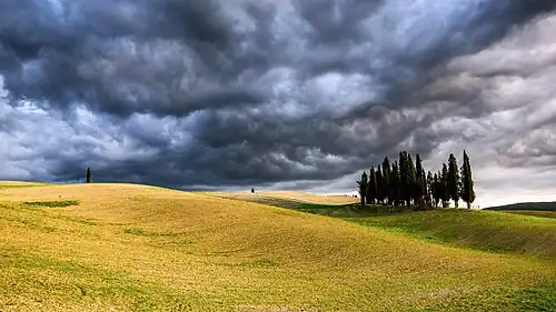 The Val d'Orcia or Valdorcia (Italian: [valˈdortʃa]) is a region of Tuscany, central Italy, which extends from the hills south of Siena to Monte Amiata. Its gentle, cultivated hills are occasionally broken by gullies and by towns and villages such as Pienza (rebuilt as an "ideal town" in the 15th century under the patronage of Pope Pius II),[1] Radicofani (home to the notorious brigand-hero Ghino di Tacco) and Montalcino (the Brunello di Montalcino is counted among the most prestigious of Italian wines).[2] Its landscape has been depicted in works of art from Renaissance painting to modern photography.