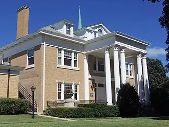 Because the neighborhood was relatively affluent several of the houses were designed by prominent local architects, and three of them lived near the park.[2] Rudolph Clausen, of Clausen & Burrows, lived in a Tudor-style house at 2330 Harrison Street. The firm also designed the H.G. Pape House at 2326 Harrison. Edward S. Hammatt, who designed multiple buildings for the Episcopal Diocese of Iowa, designed his house at 2313 Brady Street. Gustav Hanssen's house was located at 124 Rusholme Street. He also designed two Neoclassical-style houses at 2317 and 2319 Brady Street. Hanssen was in a partnership with Dietrich Harfst who designed the Henry Deutsch House at 2101 Main Street (no longer extant) and the C.E. Hanssen House at 2322 Harrison Street in the American Craftsman style. A third house attributed to Hanssen and Harfst is the Henry Heubotter House at 2116 Main Street, which is a rambling version of the American foursquare. Although they didn't live in the neighborhood, Temple and Burrows designed the Georgian Revival E.C. Mueller House at 2136 Brady Street.