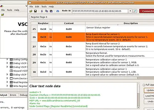 VSCPworks is the PC (Linux & Windows)-based tool to configure and manage the nodes. VSCPWorks allows reading/setting registers presenting those registers in a human-readable format by parsing the MDF file automatically. VSCPWorks also provides wizards to set the decision matrix.