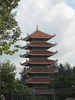 The Việt Nam Quốc Tự (lit.'National pagoda of Vietnam') is located on February 3rd Blvd., District 10 of Ho Chi Minh City, Vietnam. The pagoda, seven stories tall, is full of colorful, oversized statues of religious figures. On the first and fifteenth of the month, the pagoda opens up its third and seventh floors to the public. On other days, the second floor is accessible; it features a shrine made up of miniature Buddhas floating against a cloudy sky mural.