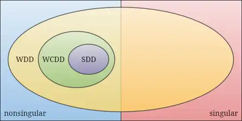We say row of a complex matrix is strictly diagonally dominant (SDD) if . We say is SDD if all of its rows are SDD. Weakly diagonally dominant (WDD) is defined with instead.