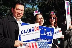 Clark's candidacy was met with strong early support among Democrats, with polling taken in fall 2003 showing Clark as a leading candidate for the nomination.[4] However, after losing several crucial early primary states, Clark ended up dropping out of the race on February 11, 2004. On February 13, 2004, Clark endorsed John Kerry at a rally in Madison, Wisconsin.[5]
