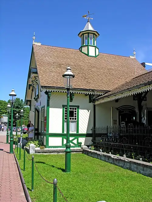 The railroad includes a 1904 Howe truss covered bridge that was originally located in East Montpelier, Vermont, where it spanned the Winooski River and carried trains for the Montpelier and Barre Railroad.[6] The bridge was purchased by the owners of Clark's Trading Post and dismantled in 1964,[7] then moved and reassembled to span the Pemigewasset River near the Trading Post.[8] During one weekend in September, Railroad Days are celebrated, with extra trains and special consists. That yearly event had stopped in 2014 and now operates every 5–10 years.
