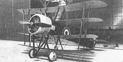 The original version had two cabane struts of long chord length supporting the upper wing. Four similar type interplane struts were used between the upper three wings, all of which had ailerons.[3] The bottom wing had a shorter span with pairs of struts and cut outs for the landing gear wheels. Because the axle was the same height as the lower wing, the tailskid was very tall to prevent that wings trailing edge from contacting the ground.[2] When tested in mid 1916 the aircraft had difficulty taking off due to shallow wing incidence and displayed dangerous tendencies because of a lack of yaw control and a major redesign was required.[5]