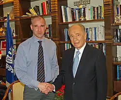 Wikinews reporter David Shankbone with Israeli president Shimon Peres in 2007