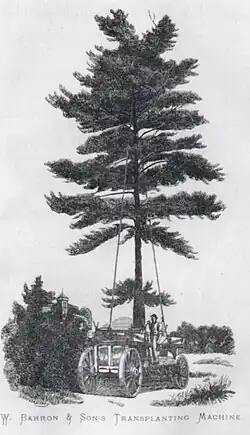 In 1831 Barron became an expert at removing and transferring mature trees - a development largely born out of the Earl's impatience at wanting to see his gardens in full splendour. Barron described his method of tree planting in his book, The British Winter Garden: A Practical Treatise on Evergreens (1852).[1][4]