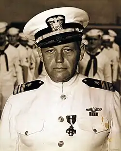 The President of the United States of America takes pleasure in presenting the Navy Cross to Lieutenant Commander William Herman Brockman, Jr. (NSN: 0-61342), United States Navy, for extraordinary heroism and distinguished service in the line of his profession as Commanding Officer of the U.S.S. NAUTILUS (SS-168), in the Battle of Midway. On 4 June 1942, Lieutenant Commander Brockman aggressively developed a contact with major enemy forces and doggedly pushed home a torpedo attack on a screened aircraft carrier against determined and repeated enemy counter measures by gunfire barrage, depth charging and bombing from the air. The attack culminated successfully and Lieutenant Commander Brockman is credited with closing and sinking of a 10,000 ton enemy aircraft carrier. His skill, determination, courage and fortitude were in keeping with the highest traditions of the Naval Service.[2]