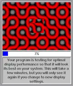 WinG would also perform a graphics hardware/driver profiling test on the first execution of the program in order to determine the best way to draw DIBs. This test showed a window full of red curved lines, sections of which would wobble as performance was tested. Once WinG had determined the fastest calls that did not cause graphics corruption, a profile would be saved so that the test would not need to be performed again.