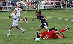 Soccer game between Japan and United States. Goalkeeper Hope Solo lies on the ground saving a ball, while Wambach is next to her.