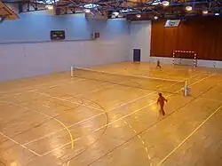 An indoor wood tennis court.