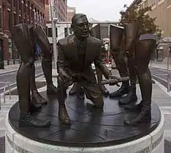 Wooden's Legacy is a public artwork by American artist Jeffrey Rouse that is located on the west corner of Georgia and Meridian Streets, in Indianapolis, Indiana. The bronze sculpture, which was unveiled on March 9, 2012,[1] depicts Indiana-born college basketball coach John Wooden in a crouching position in the act of coaching. He is surrounded by five basketball players represented as sets of legs, each in a style that depicts an era from Wooden's career. On and around the base are words and quotes that define Wooden's coaching philosophy, including his "Pyramid of Success".