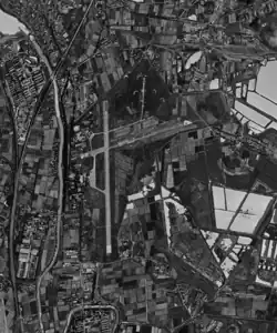 In 1936, to defend against threats from invading Japanese forces, the Hubei provincinal government started the construction of an airport on the bank of South Lake (after which the airport is named after) in Wuchang District.[2][3] The completed airport has one runway in the east-west direction paved with gravel, and was managed by the Republic of China Air Force (ROCAF). In 1938, after the outbreak of the Battle of Wuhan, the Military Affairs Commission made the decision to abandon the city, and troops in the city destroyed the remaining key infrastructure, including Nanhu Airport.[4]