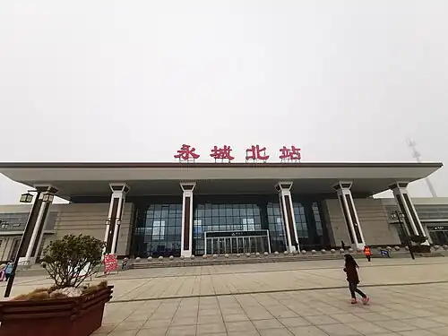 Yongcheng North railway station (Chinese: 永城北站) is a railway station of Zhengzhou–Xuzhou High-Speed Railway in Mangshan Town, Yongcheng, Shangqiu, Henan, China. The station started operation on 10 September 2016, together with the railway.[1]